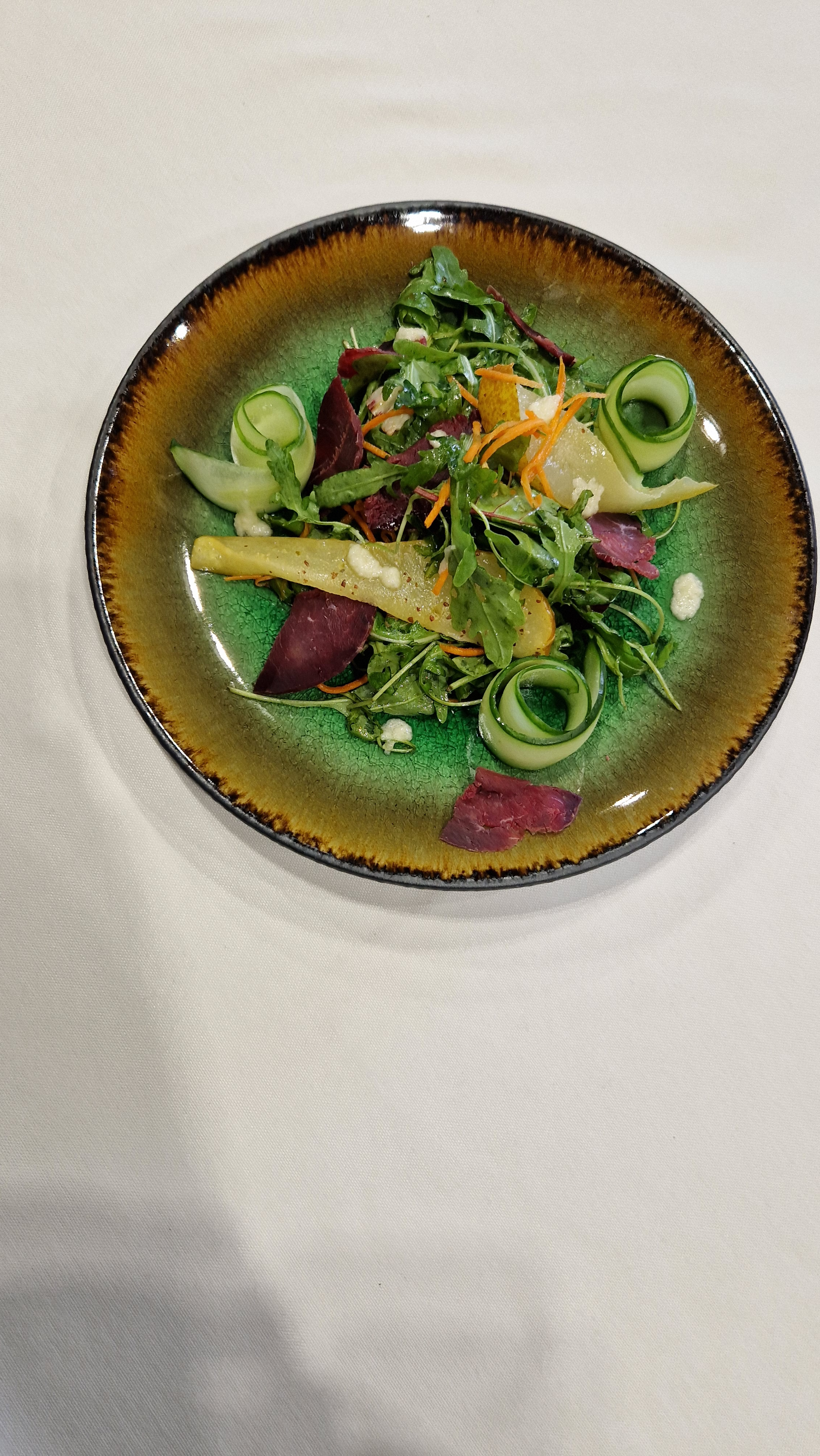 • Салат сезонный с томленной грушей, свежим огурцом и сыровяленным лосем.