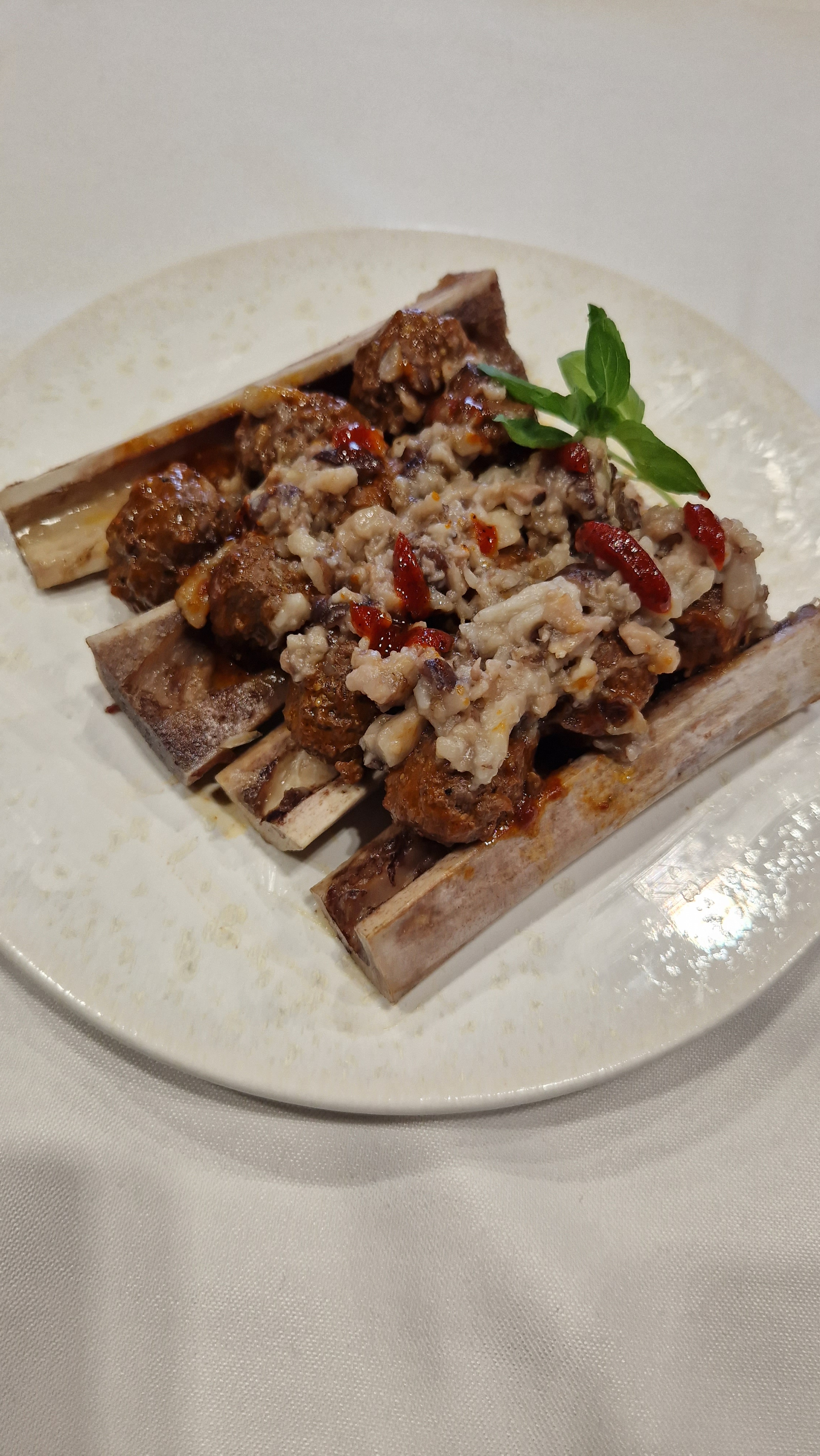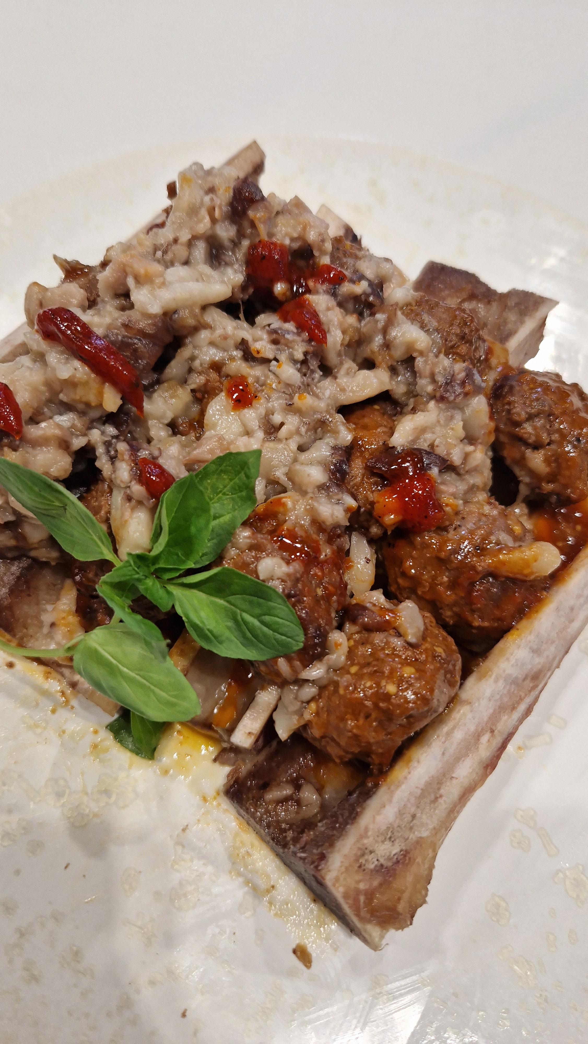 • Фрикадельки из фарша лося с салом кабана в соусе итальянском , на костичке с запеченным мозгом