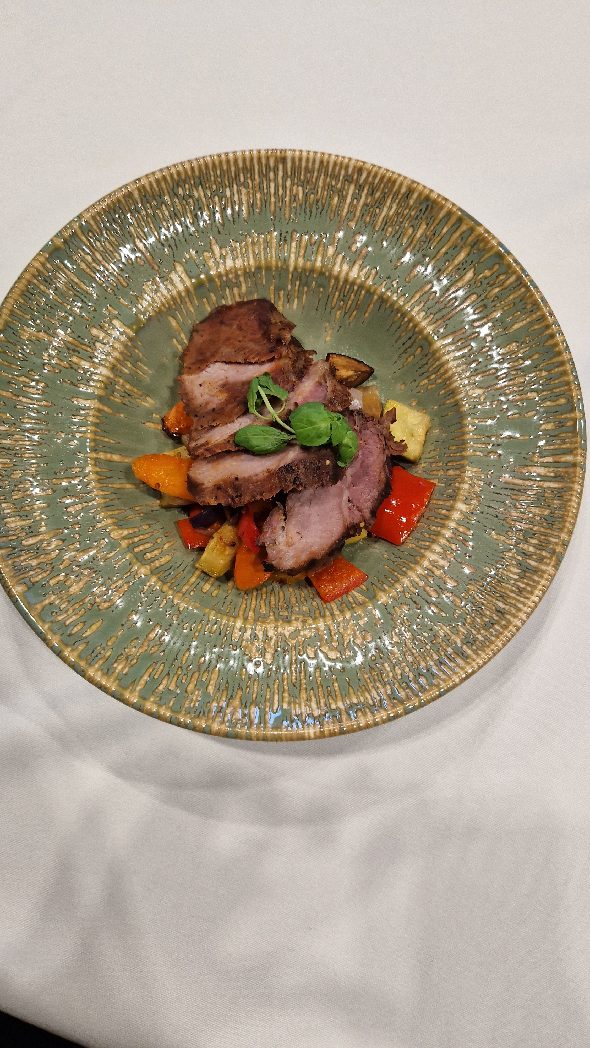 • Косуля с хумусом , икрой из свеклы и овощами гриль