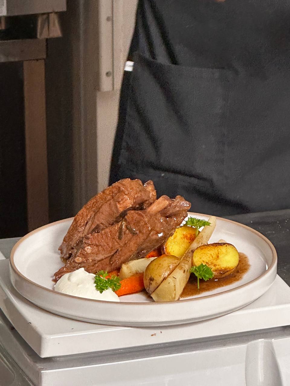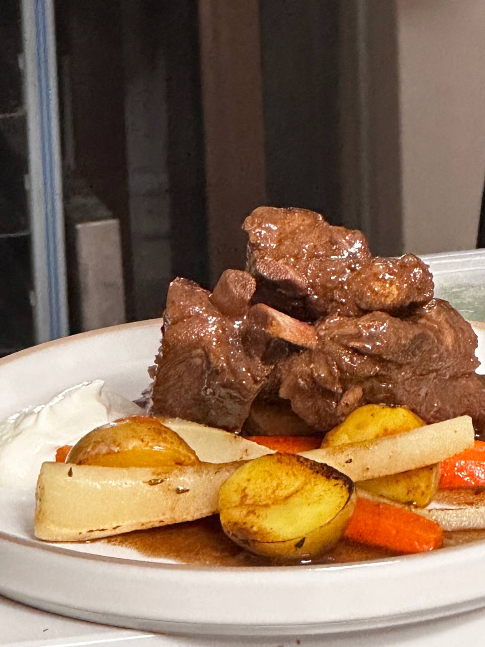 - Ребра кабана с овощами ( пастернак, морковь и бейби картофель), сметана с хреном копченная и соус демиглас из дичи