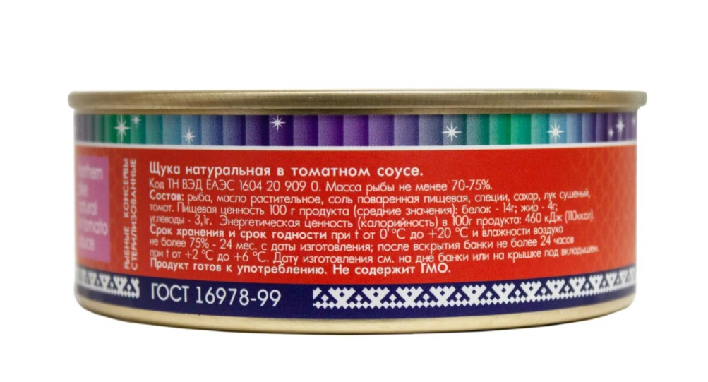 | Состав: | щука, масло растительное, соль поваренная пищевая, специи, сахар, лук сушеный, томат |