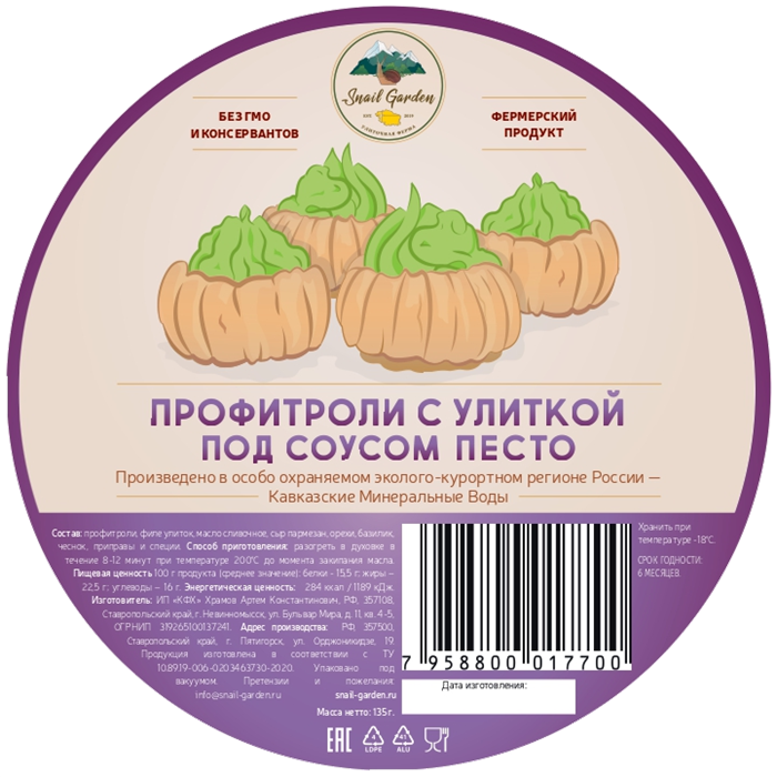 Состав: профитроли, филе улиток, масло сливочное, сыр пармезан, орехи, базилик, чеснок, приправы и специи