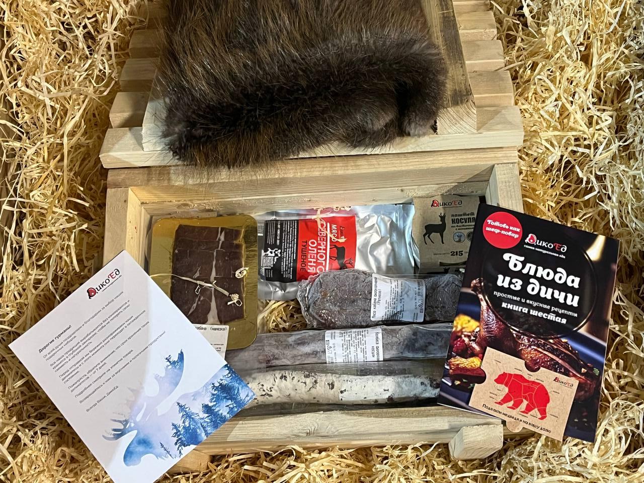 Набор упакованный в крепкий «Дикий ящик » станет идеальный вариантом для подарка на любой праздник. Хэндмейд упаковка выполнена из строганных и обожженных сосновых досок и имеет размеры 50х33х21 сантиметров. Внутри коробки находятся не только деликатесы из тушеного мяса и паштетов, но и сувениры в виде бобровой шкуры и медвежьего когтя. В набор можно дополнительно добавить другие продукты из нашего магазина. Также за дополнительные 600 рублей возможно персонализированное брендирование. На нанесение изображения или надписи уходит 2 дня. Предварительно нужно предоставить рисунок в векторном формате.